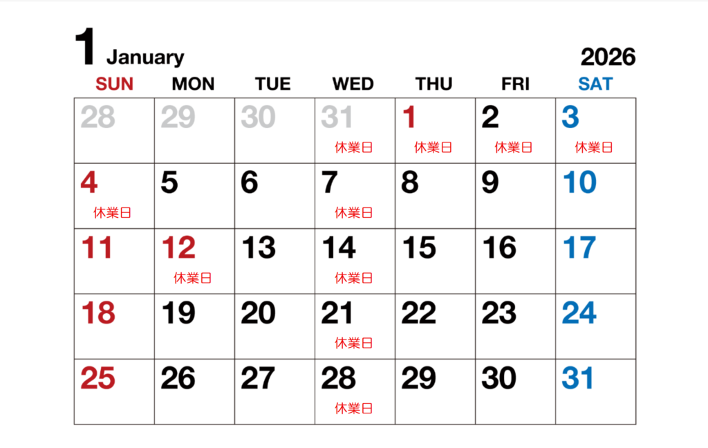 年末年始休業日 12/29~1/4