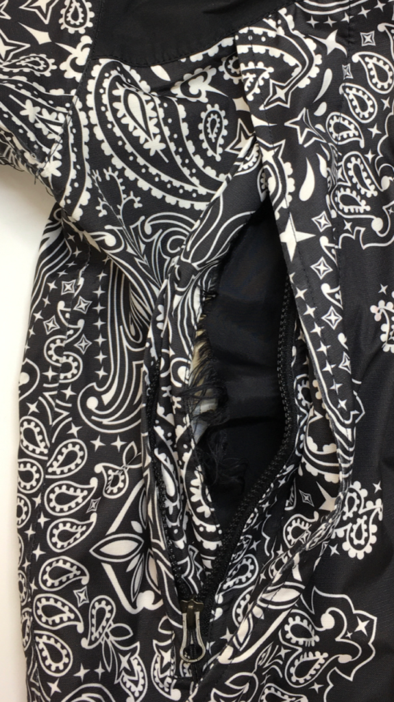 ご依頼いただいたマウンテンパーカーですが、ファスナー付きのポケットの中の生地が端の縫い目から外れてしまい、更に縫い代が解けた状態でした。