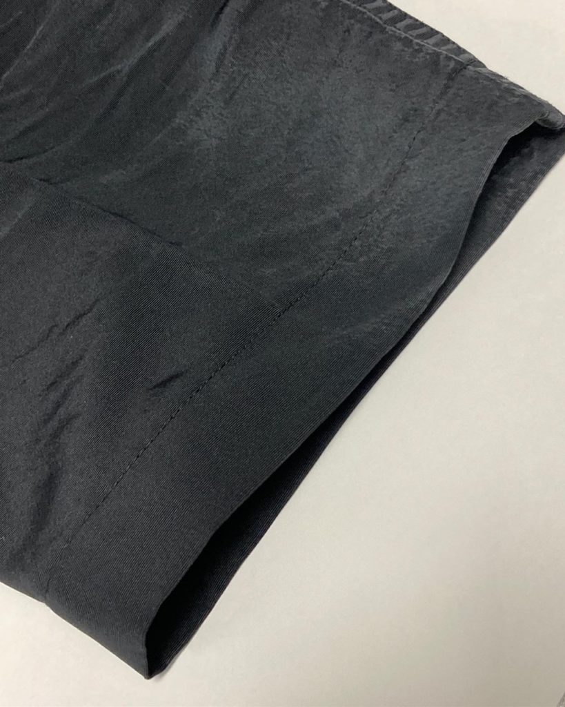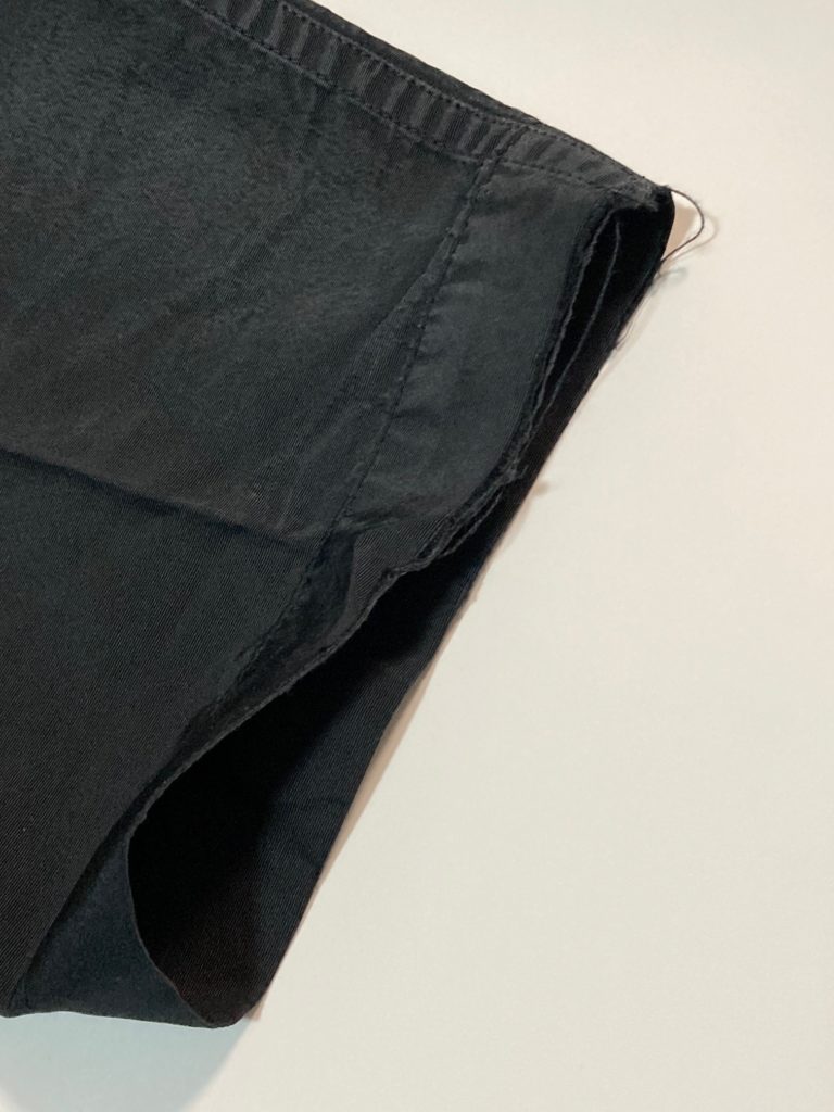サイド生地を足さずに脇に自然に繋がるように裾まで同じ幅で縫い込んでいるので違和感なく仕上がっています。